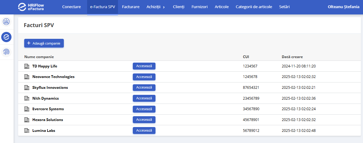 După autentificarea în platformă, navighează către secțiunea e-Factura SPV din meniul principal. Aici vei găsi o listă completă a firmelor conectate la SPV, afișate alături de: